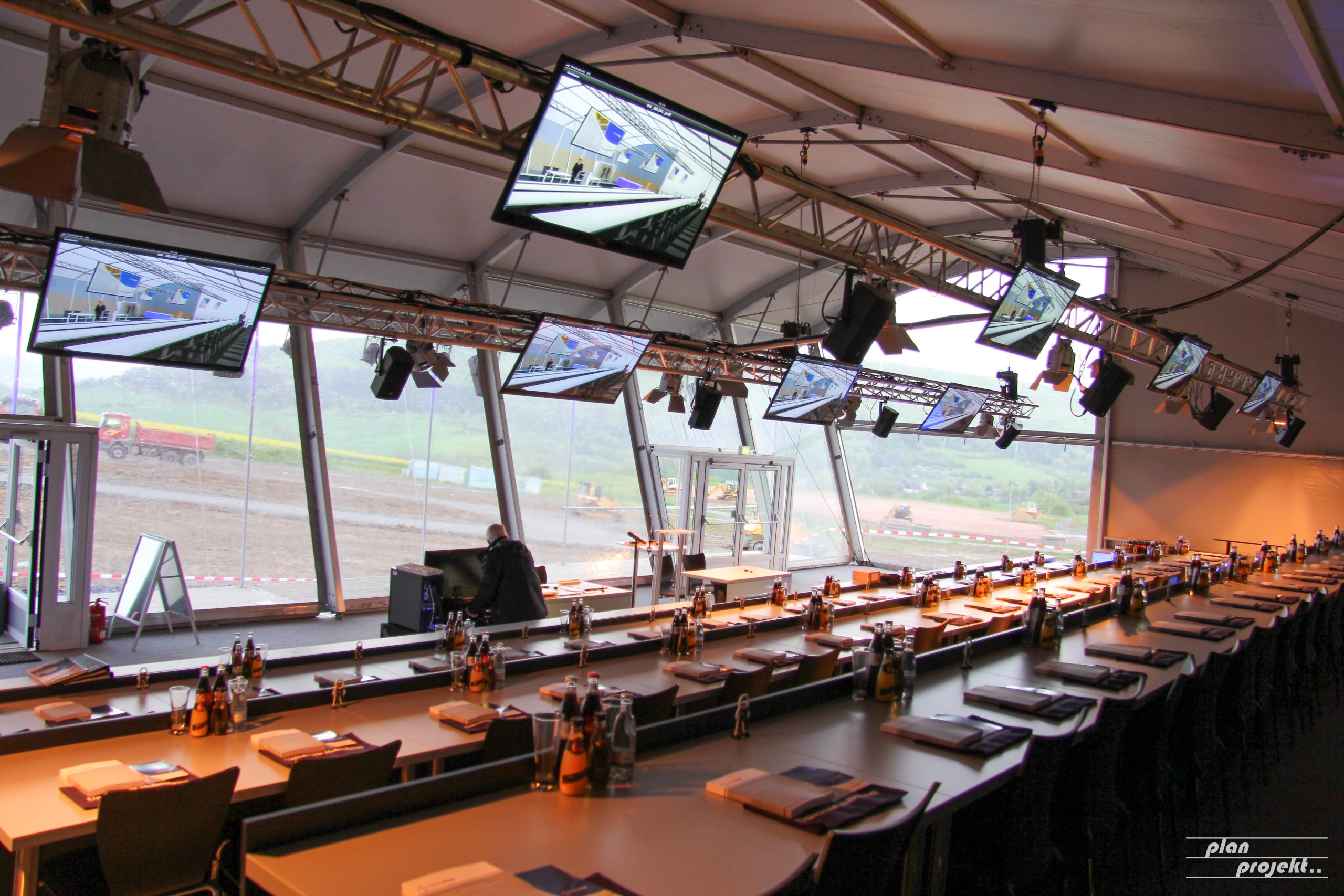 … und trotzdem zum Ziel führt? Genau! Denn wie vermittelt man eine zukunftsweisende Maschinensteuerungssoftware besser als auf einer Live-Baustelle? Das Gelände im thüringischen Walldorf war schnell gefunden. Schnell beschlossen war auch der Bau einer tribünenähnlichen Zeltkonstruktion mit Blick auf die Live-Baustelle. Im Inneren des Zeltes würden die Gäste die Arbeit der Software auf Monitoren verfolgen können.